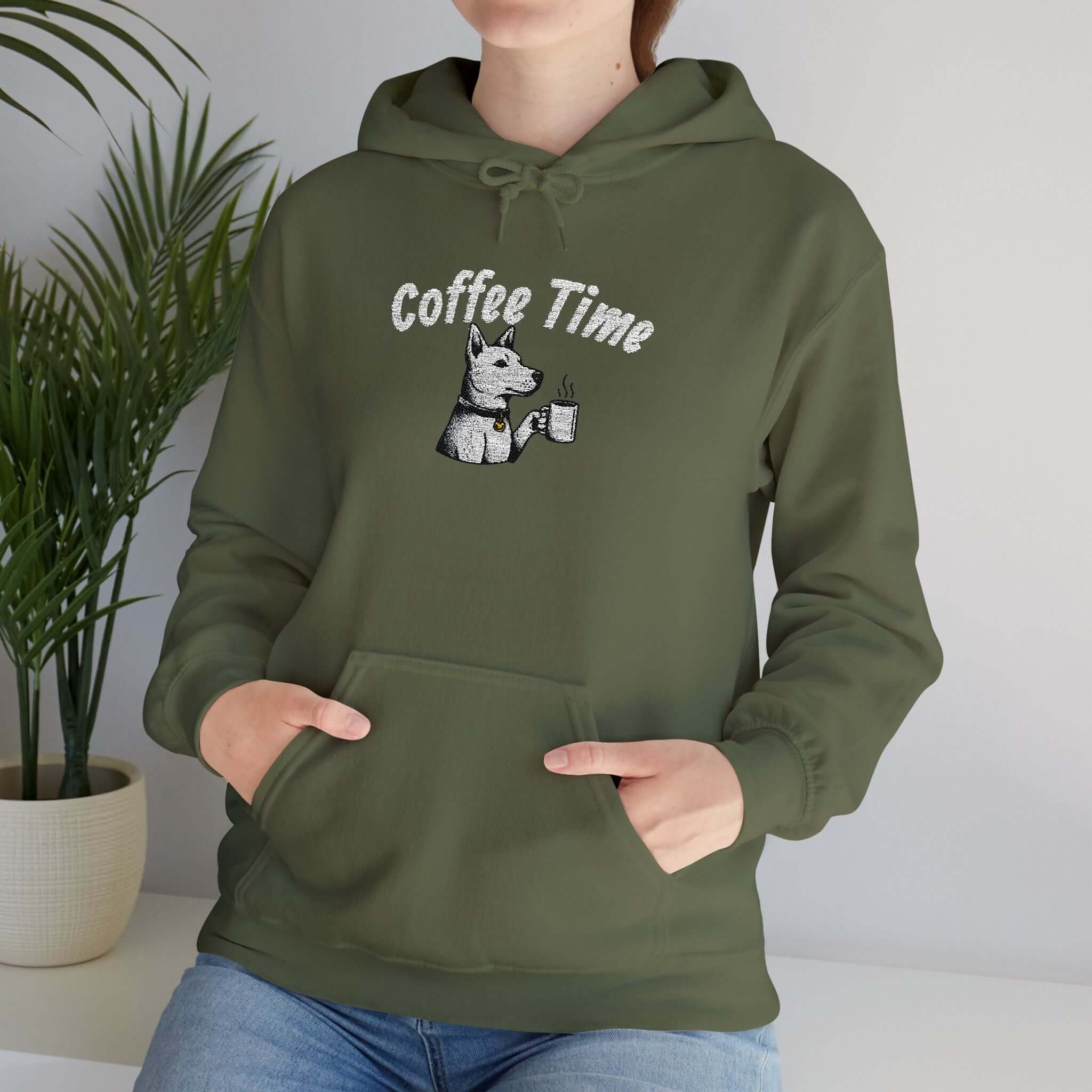 Coffee Time Dog Embroidered Pullover Hoodie – Cozy and Comfortable